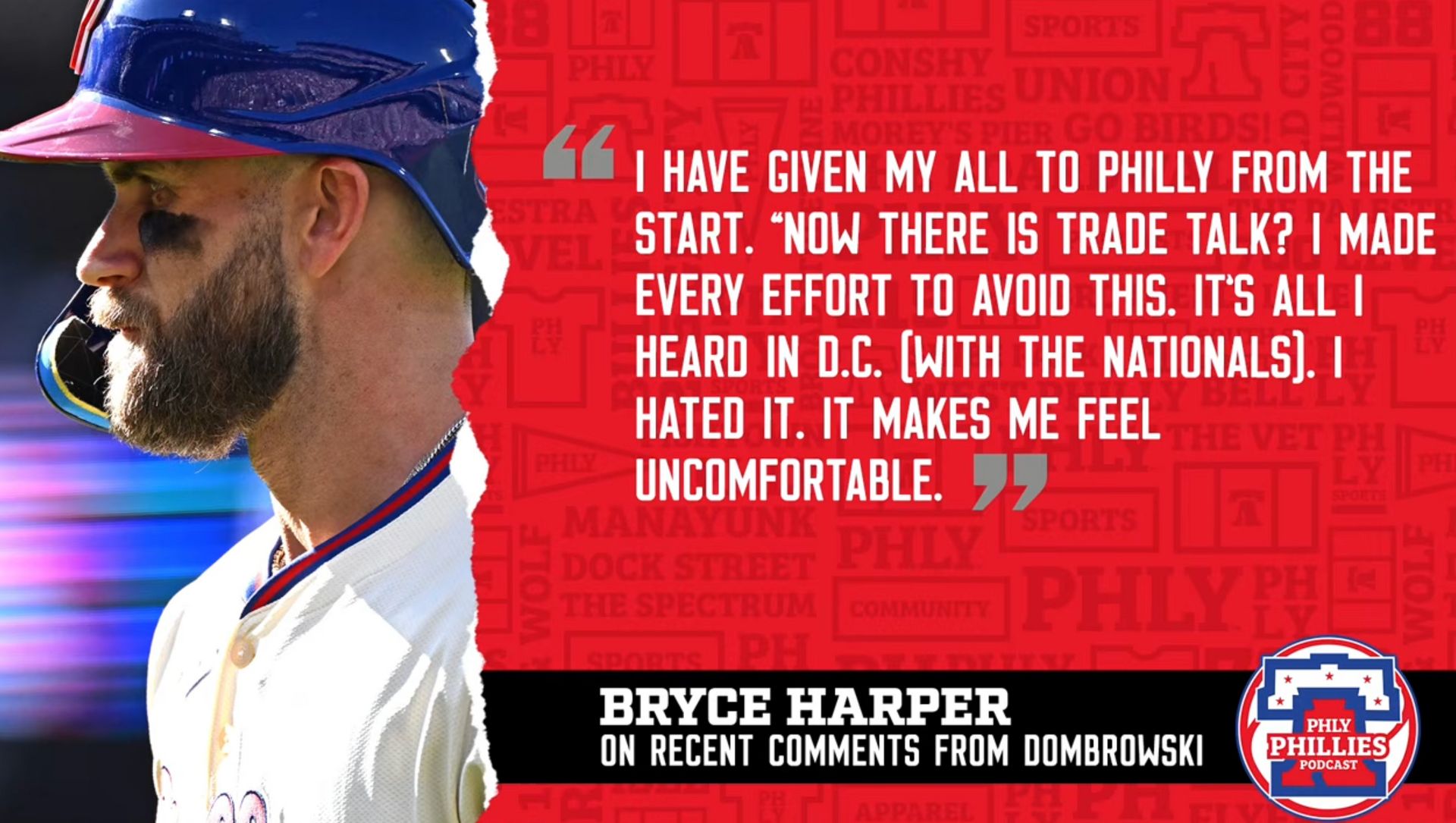 Whatever that reason, though, Bryce clearly did not like it. Credit to Matt Gelb for getting Harper’s thoughts over the weekend, including this little ditty: “It’s disappointing to hear me being questioned about my contribution to the team. Just really hurt by that notion because I love Philly so much.”